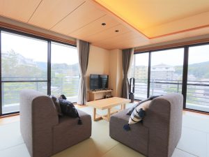 「蒼星華」は本館大泉閣の角部屋に位置し、大きな2つの窓からは日本庭園が見渡せる当館でも一二を争う眺めの良い四季の色豊かな客室です。