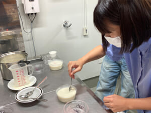 • ポイント2 ご家族での体験に! 温めた豆乳に天然にがりを加えて混ぜるだけですが、その加減はとても微妙なもの。美味しい豆腐作りの秘密に触れることが出来る体験メニューです。
