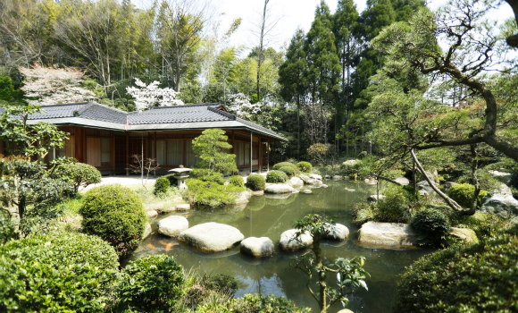 Chorakuen has a circuit-style Japanese garden of 33,000 square meters. The garden is colored green by plants and the hundreds of species of trees and changes hues with the transition of the seasons.