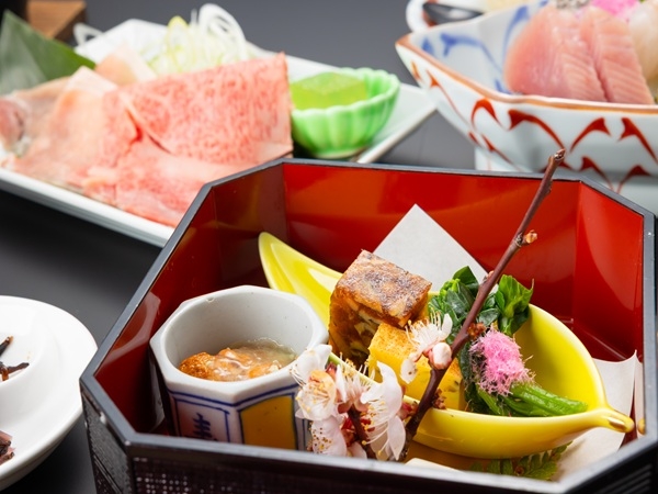 Chorakuen: Monthly Seasonal Kaiseki Rice cooked with seasonal saury and maitake mushrooms! Enjoy your Shimane Wagyu beef from the Japanese style tabletop stove by dissolving the collagen cubes served on the side in dashi broth. ◆Monthly Kaiseki Menu Appetizer: Assorted Seasonal Sashimi: Local Seafood Platter Vinegared Dish: Mixed Autumn Flavor Dressed salad Japanese tabletop stove: Shimane Wagyu Beef Shabu-Shabu Special Sesame Sauce and Flavor-Changing Collagen Cubes Hot Dish: Steamed Chinese yam egg custard Light Dish: Izumo Soba Relish Dish: Denpo-style wrapped Scallop and Mushroom Main Dish: Maitake Mushroom Rice Soup: Lotus Root Dumpling Pickles: Assortment of 2 Types Dessert: Choraku Pudding and Seasonal Fruit *This menu is subject to change depending on the ingredients. ◆Dining Location ・In-room dining is not available. ・Chairs, tables, and seating will be provided in the dining area. ◆Food Allergy Responses *If you have a food allergy, please submit the "Allergy Response Confirmation" form at the bottom of our official website after making your reservation.