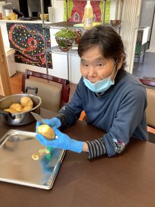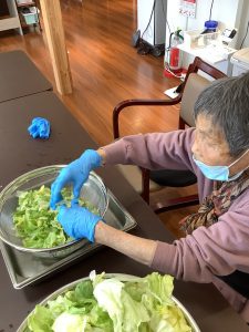 一回目と同様、キッズ包丁、ピューラー安全に使えるものを用意して、利用者様に切って頂いたり、野菜を手でちぎってもらったり、ゆで卵の皮をむいでもらったり❣