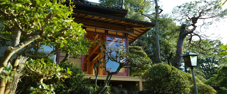⽇本庭園内の⼩⾼い丘の上に建ち、縁側を降り、専⽤庭園から泉⽔や⽇本庭園を⼀望できます。寝室はPOLAが開発した低反発マットレスと⾼級⽻⽑布団を使⽤しています。